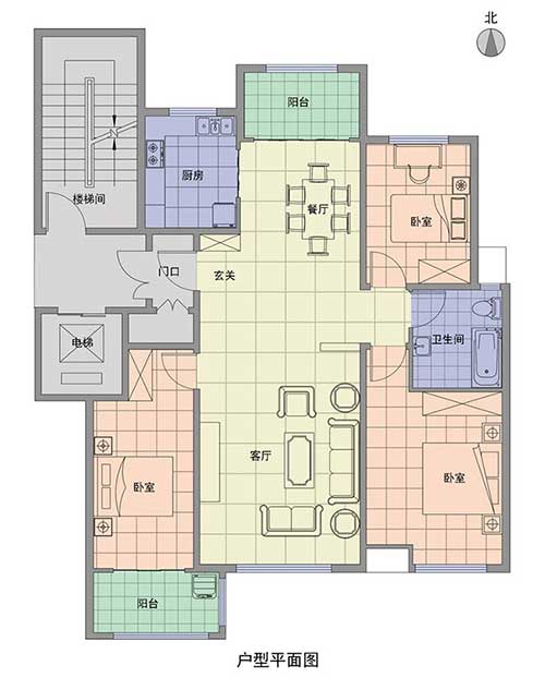 先來一張王先生家的戶型圖,三室兩廳一廚一衛,雙臥室、客廳向陽,南北通透,可算是一個很好的戶型。